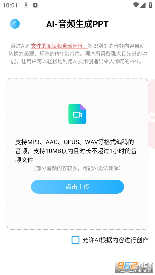 4、AI音频生成PPT,通过A对文件的阅读和自动分析,将识别出来的音频内容自动转换为美观、规则的PPT幻灯片。