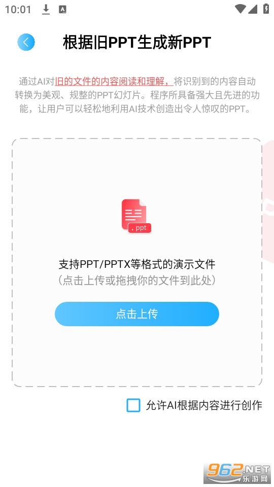 3、从旧PPT生成新PPT,上传现有PPT,并使用AI推荐改进版本或新主题设计。