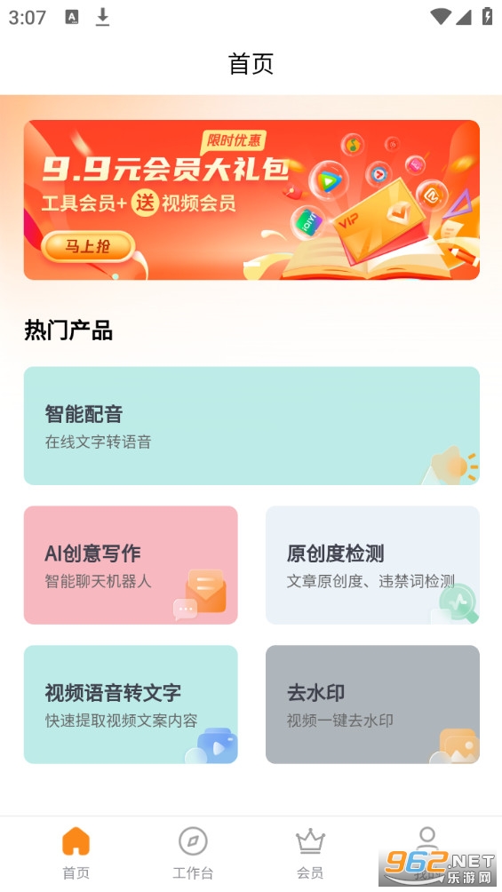 应用内有智能聊天创作机器人、去水印、视频文案提取、文章质量检查、智能配音的功能。