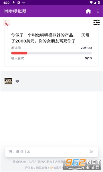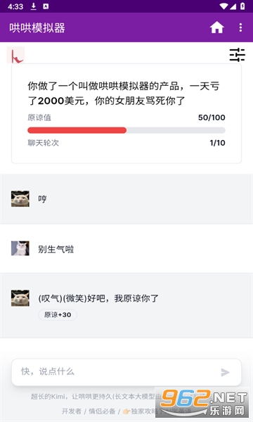 《哄哄模拟器》是最近qq空间,网上爆火的在线哄赛博女友的游戏。基于AI技术的交流沟通模拟软件。通过使用精准的语言技巧和沟通能力,用户可以在限定的次数内尝试说服对方原谅自己。这款软件帮助用户提升沟通能力和解决冲突的技巧,让用户更好地应对现实生活中的各种挑战。