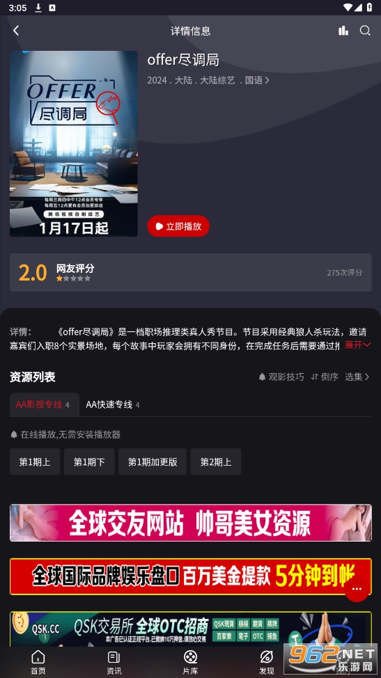 4、智能推荐:AA影视拥有智能推荐系统,能够根据用户的观看历史和兴趣推荐适合的影视内容。用户可以通过个性化推荐发现更多感兴趣的电影和剧集,丰富自己的观影体验。