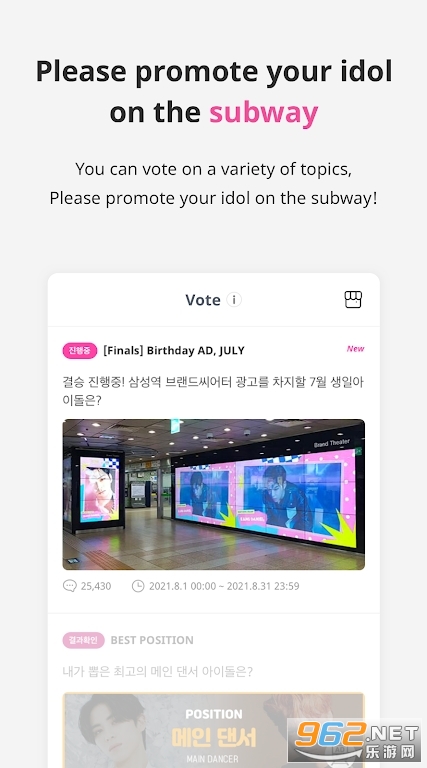 通过这个客户端,你可以为喜欢的爱豆投票,帮助他们取得更好的成绩和展示机会。该客户端提供了投票打榜功能,并汇集了丰富的明星资讯和赛事活动。你可以参与明星话题讨论,关注更多明星,还可以参与各种明星互动活动。这款客户端还提供最新的动态和日程情况提醒,确保你不会错过任何重要内容。通过这个应用,你可以实时了解你喜爱的韩国偶像的动态,结识更多同好,让投票和交友更有趣。