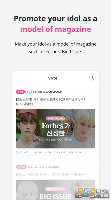 一款针对韩国综艺节目《Show Champion》而专门转呗的官方投票的客户端。为了自己喜欢的爱豆疯狂投票,帮助他们获得更好的前途,这是每一个粉丝都应该做的事情。不仅仅是希望他们赚钱,更是希望他们有机会有更多的作品展现给我们!寻找冠军秀入口,选择自己喜欢的歌曲,轻松松松为你喜欢的偶像投票,助ta登上冠军的宝座,并且还能观看现场直播!
