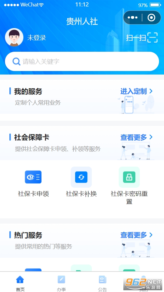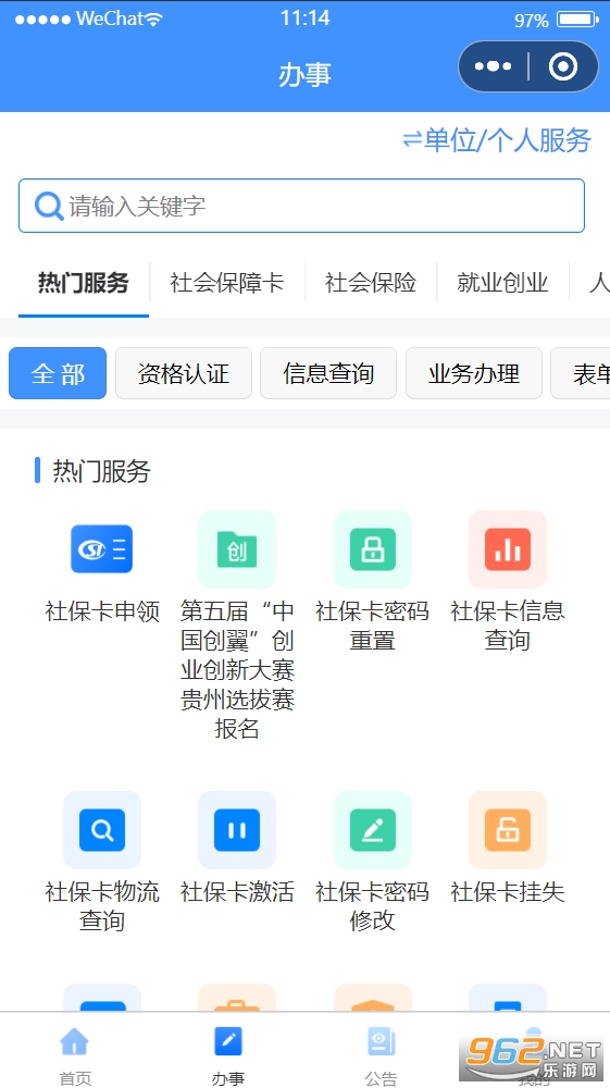 贵州人社公共服务平台移动服务,业务包含社会保险,就业创业,人才人事,劳动关系,社会保障卡等服务内容。能够快速的在线办理相关业务,方便快捷。