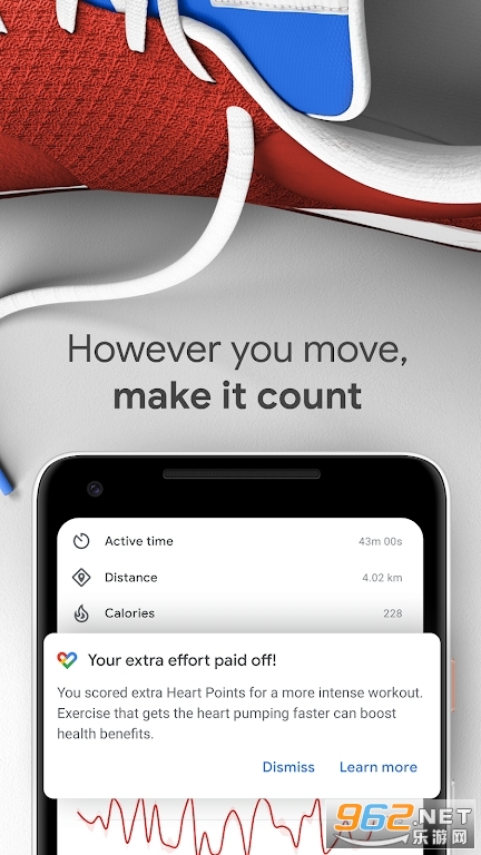 如果您全天步行、跑步或骑自行车,您的 Android 手机或 Wear OS by Google 智能手表将自动检测您的活动并将其添加到您的 Google Fit 日志中,以确保您的每一个动作都获得奖励。想要额外的积分吗?通过开始有节奏的步行锻炼并随着节奏迈步,加快步行节奏。享受不同类型的锻炼吗?从普拉提、划船或动感单车等活动列表中进行选择,Google Fit 将跟踪您获得的所有心肺积分。