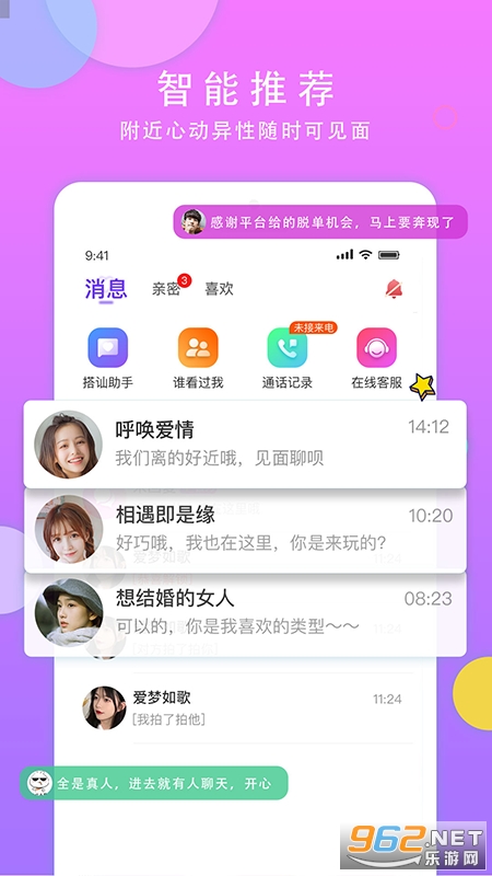 拥有海量的单身异性用户提供给你进行查看跟交友,从而帮助你快速的遇见自己的另外一半