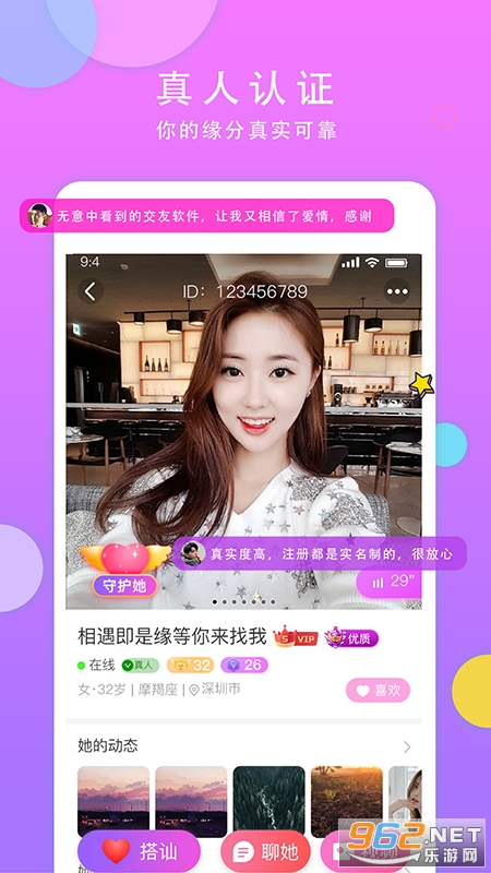 所有的用户都是经过个人真人认证的,以此来让你获取到真实的交友体验
