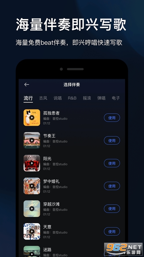 音控提供海量免费伴奏,无需自学编曲。伴奏即选即用,涵盖流行、说唱、摇滚、古风、民谣、电音、弹唱等多种曲风。未来我们会邀请更多编曲人入驻音控,为大家提供更多优质伴奏,不过这部分未来可能会收取一部分费用,毕竟编曲老师也要吃饭滴。