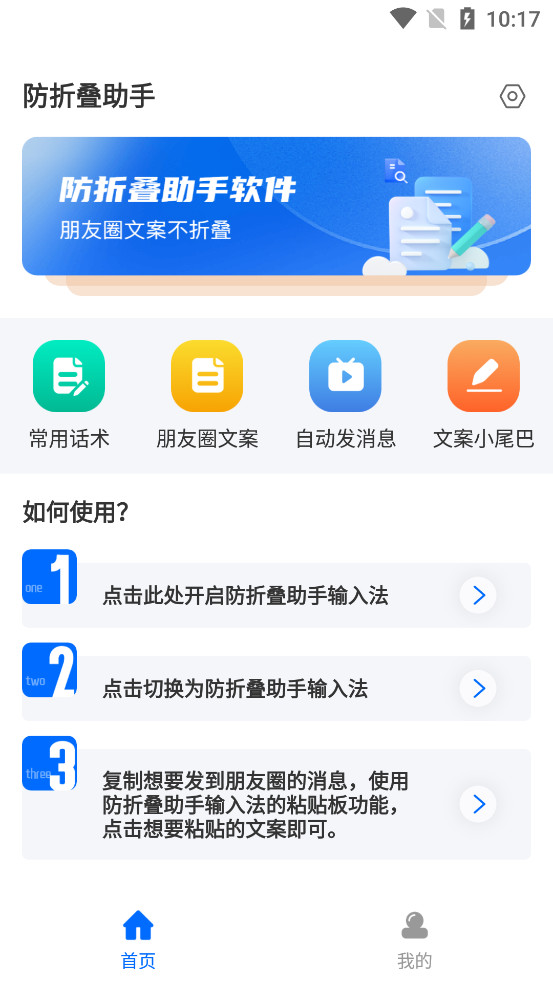 《防折叠助手》是一款为喜欢发朋友圈的朋友们打造的内容防折叠软件,一般来说朋友圈如果文字或者图片太多都会折叠起来,使用本款软件可以打破朋友圈折叠困扰,可以完全展示文字和图片,软件中还有着各种话术和文案可以复制使用。