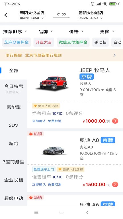 4、浏览可用车型列表与价格,根据需求筛选并确认最终租赁车辆。