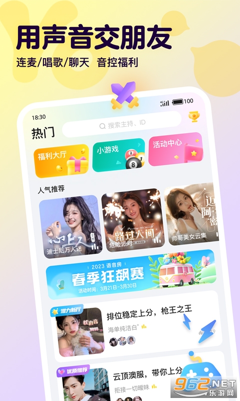 Yo语音app这是一款能够获取到很多高质量直播恋爱社交体验的应用程序软件,通过该Yo语音最新版软件APP轻松即可认识到很多有趣异性陌生好友,超多趣味才艺直播表演内容轻松在线观看想享受。