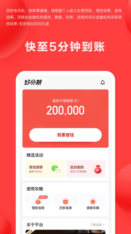 好分期是一款专为年轻人打造的在线信贷科技服务平台!好分期为金融机构和有需求的客户提供全流程科技及辅助服务。好分期提供的合作金融机构信贷产品期限灵活,多至可分12期随心还,用手机即可申请,操作流程简单明了,可以在线清楚查看借款还款进度,减轻你的临时经济压力。我们还提供新人还款优惠,会员优惠券等多项特权,快来下载好分期领取你的惊喜额度吧!