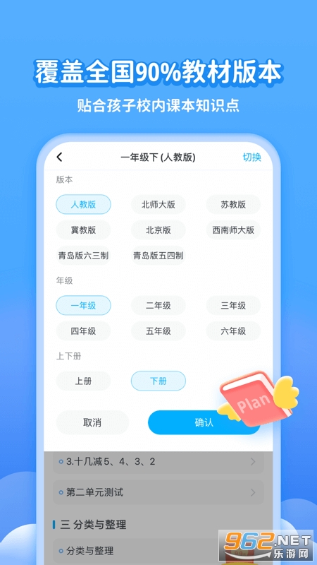 覆盖人教版、北京版、苏教版、西师大版、青岛版、冀教版等95%以上教材,100%与教材内容同步,按照课本单元章节生成动画视频清单,针对语文数学英语不同学科的特点及内容,配套专项学习工具;