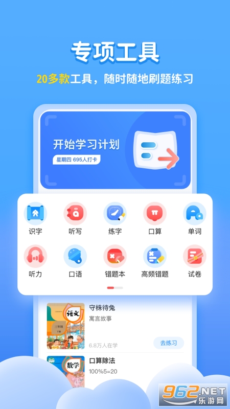 学宝APP配备识字、听写、练字、口算、单词、听力、口语、错题本、知识点、课本点读、听课文、作文、字典等20多款智能教辅专项工具,解决小学生课内学习问题。