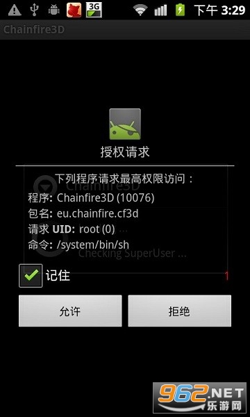 1、首先安装Chainfire3D.apk文件,然后在提示授权请求的时候,点击允许;