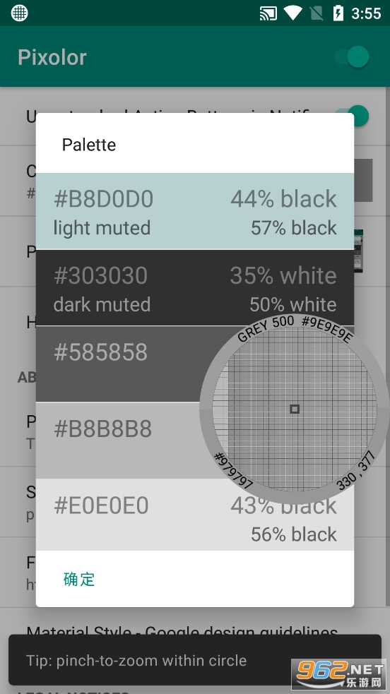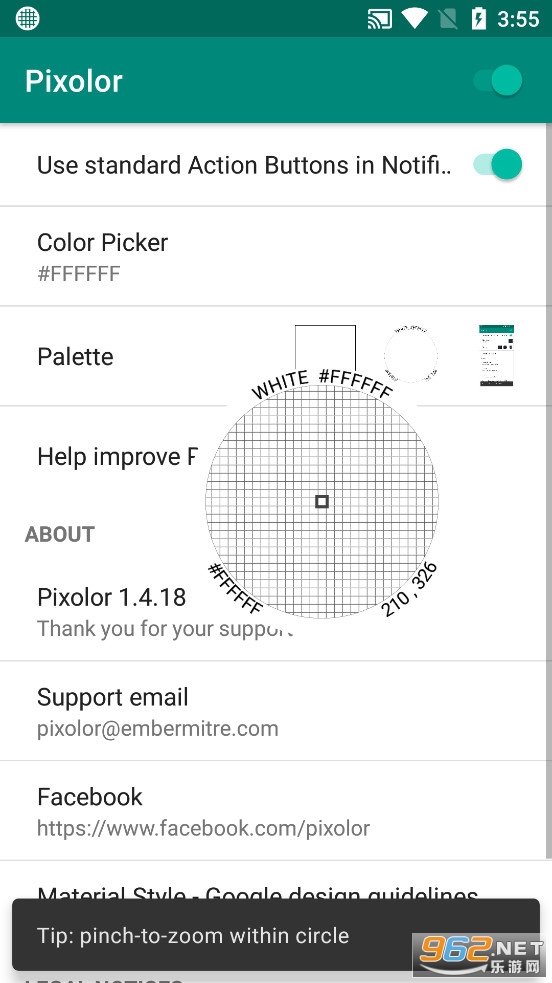 Pixolor是一个在你的应用上展示的圆形的浮动取色盘,可以用来显示放大之后的像素,以及颜色信息和其坐标。