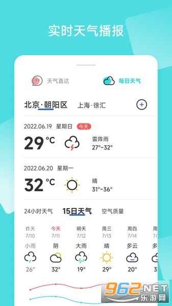 实时天气,特色的实时天气系统,每个时段的天气变化一键查询,更有智能提醒异常天气
