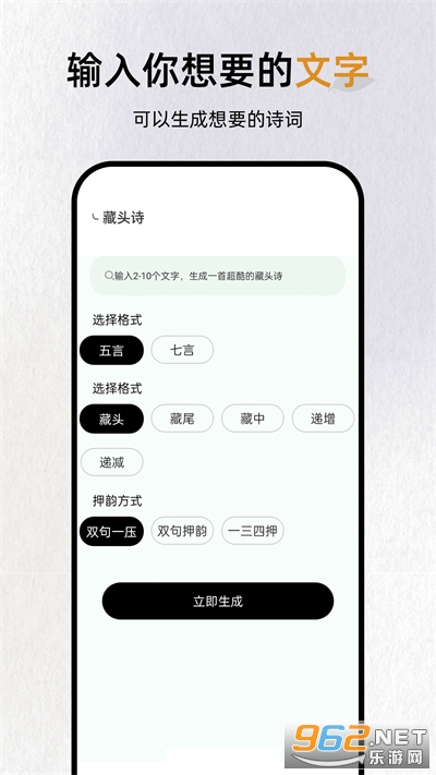 1、点击“藏头诗”在搜索框输入自己想要表达出的意境,选择好格式以及押韵方法,点击“立即生成”即可