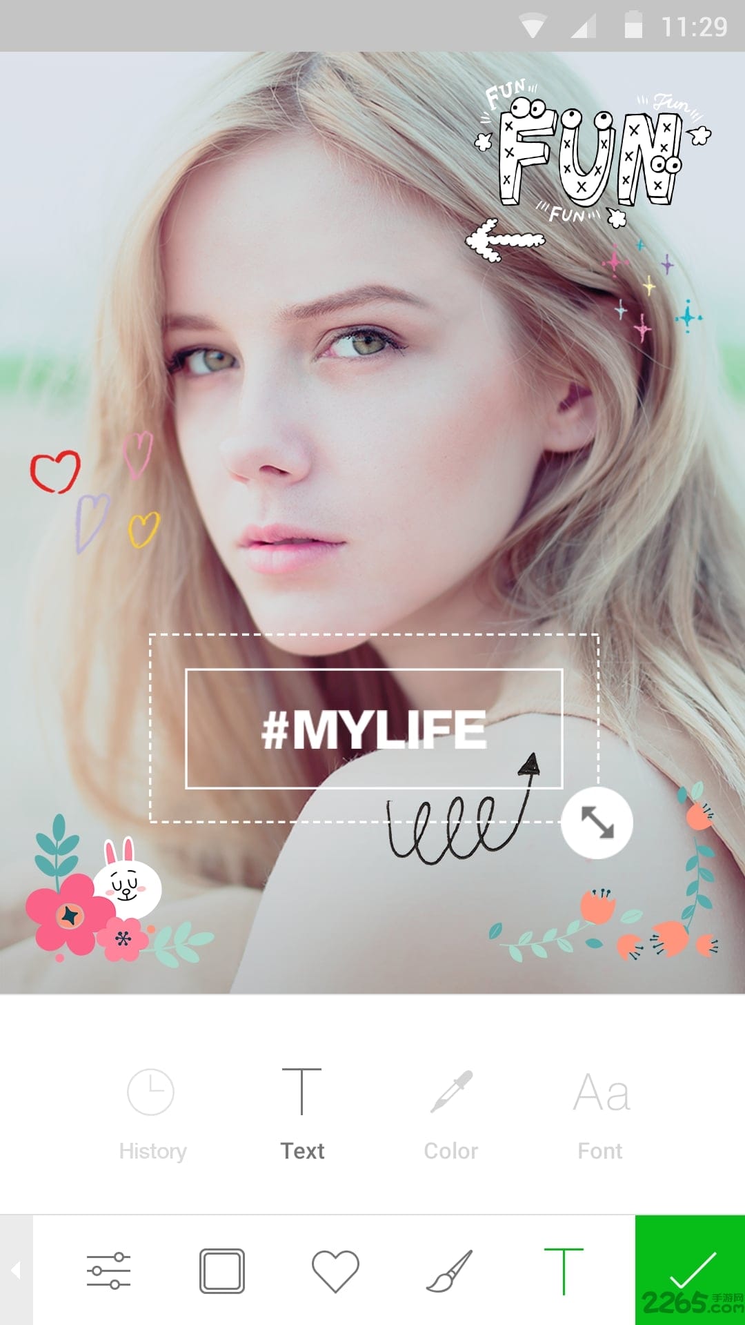 接下来可以给图片添加文字、原创涂鸦等效果,软件自带多大156种不同类型的笔刷及字体,这对于单色调的图片来说可以起到点睛之笔的作用。