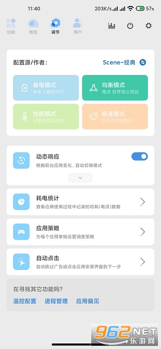 针对于你的手机性能环境,能从硬件方面真实的去进行调节,省电模式、均衡模式,性能模式、极速模式、你甚至能做到去创建应用策略来避免不必要的电量耗损,让你的手机想快就快,想省电就省电。如果你的手机有Root权限,那么能使用的进阶功能就越多。