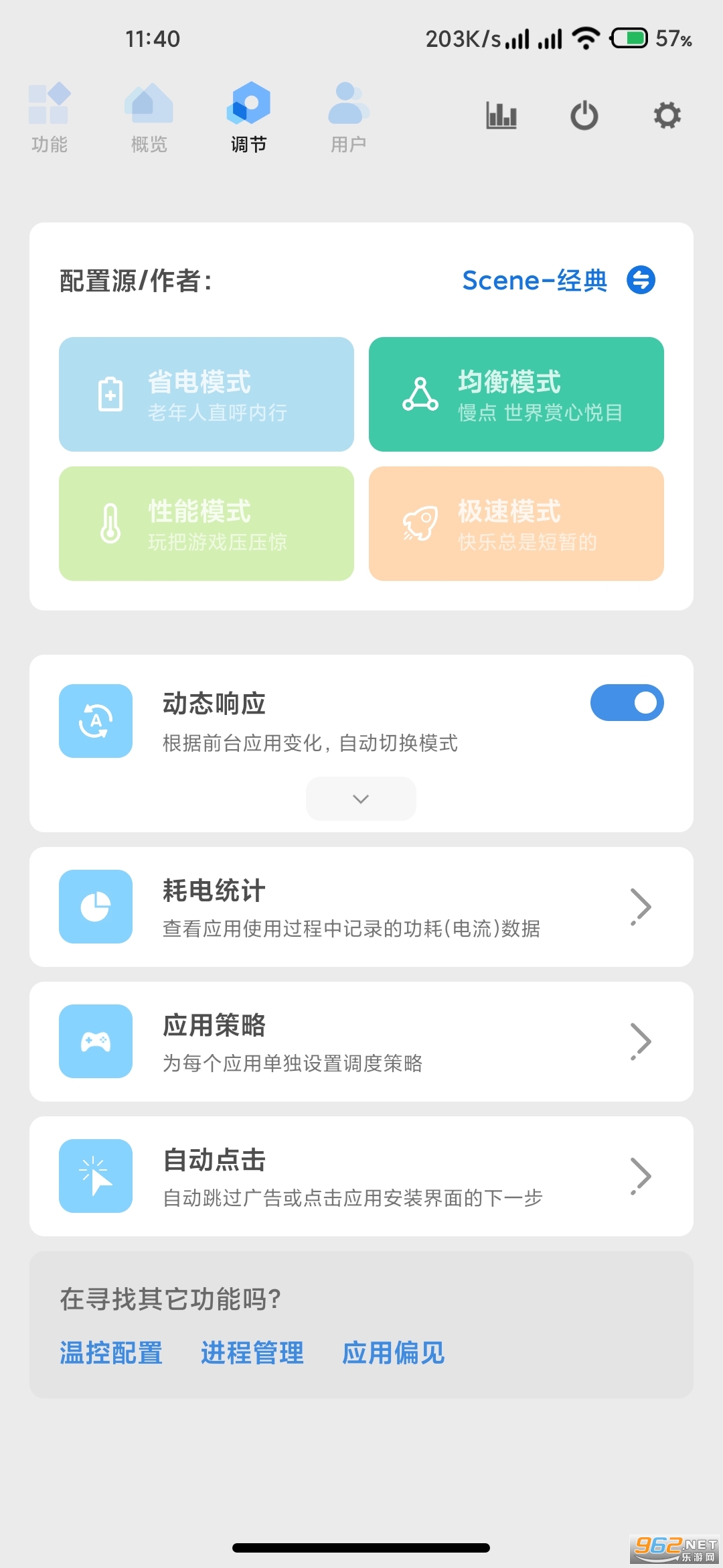 6、场是模式:用户通过对每个应用进行设置,可达到根据应用调整Soc性能、屏幕亮度等目的。