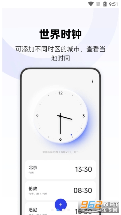 用户可以自定义设置闹钟铃声,查看世界各个地区的时间等;