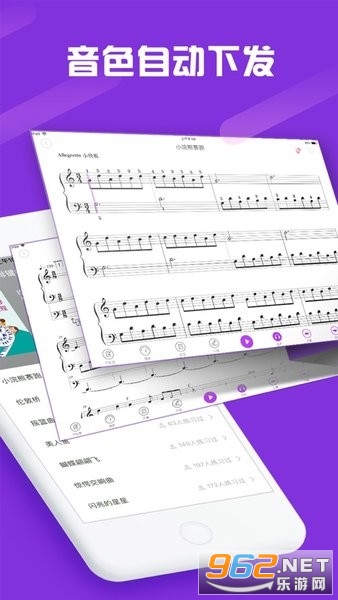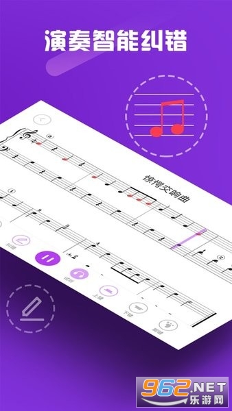 乐曲演奏:可选择不同的演奏模式,如:识谱、纠错、跟奏,可自由调速,分手/脚单独练习;