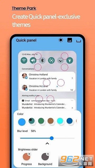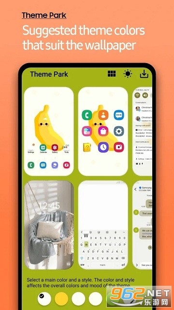 《三星主题公园app》(Samsung Theme Park)这款应用可以定制用户三星手机的下拉菜单、多任务界面、锁屏时间等画面,还可以通过不断组件来实现扩展服务,用户可以选择不同的主题,且主题的颜色可以从桌面壁纸上自动提取并生成,让你的手机桌面更加的直观大气。