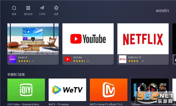 下载中文版,或者添加辅助工具 使用Emotn(艾蒙顿)TV Store是一款面向全球的安卓大屏端应用商店。虽然是服务全球用户,但是因为有中文版,所以国内用户借助辅助工具用起来也很方便。