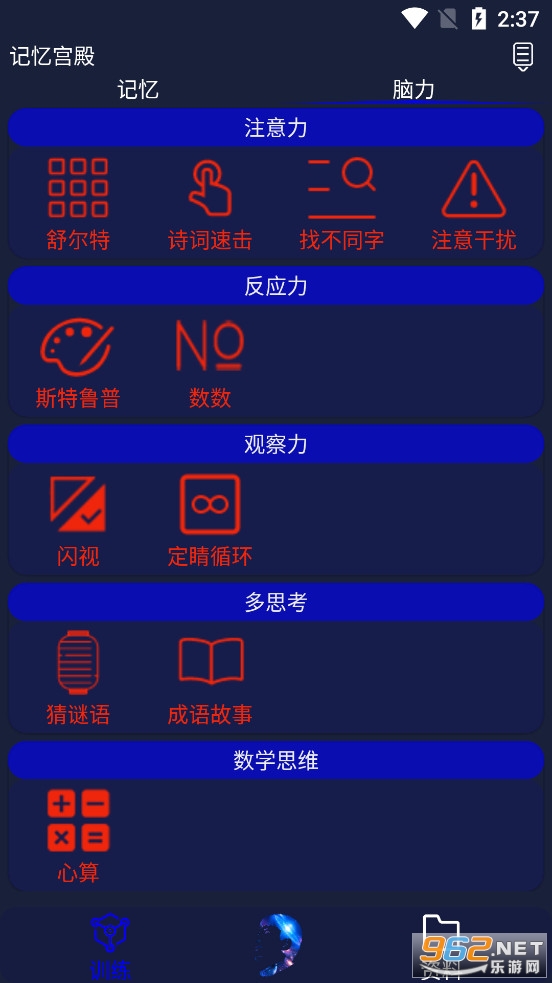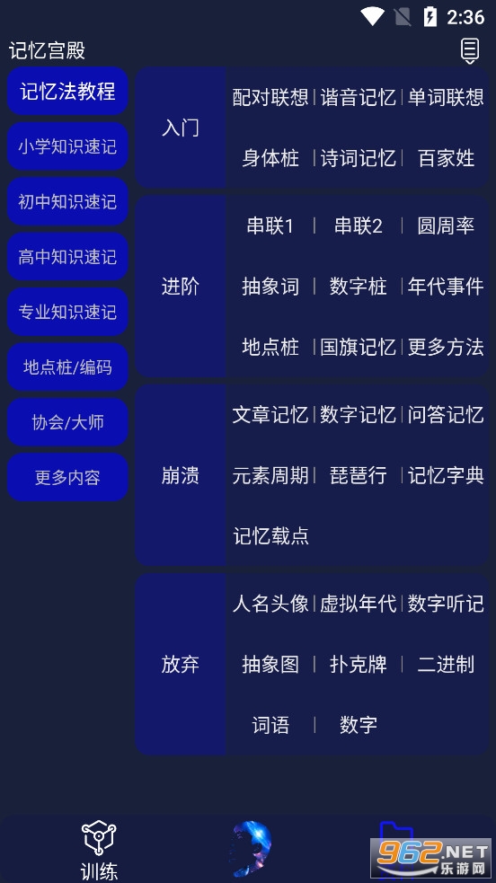 记忆宫殿APP是一款安卓手机应用,主要功能有记忆力、注意力、判断力、思维等脑力训练,记忆方法理论讲解,还有语文、历史、地理、单词等学科的知识点速记方法。其中记忆力训练是需要运用联想记忆、记忆宫殿等记忆方法。