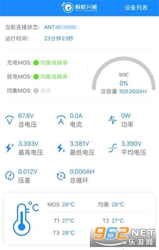 《蚂蚁bms安卓》是一款锂电池配套管理办公软件。和配套的设备搭配使用,用户可以通过此app远程修改设备的相关参数,查看电池的电压,电流,压差等信息和相关参数,随时对设备进行控制,操作方便,需要的话就下载吧!
