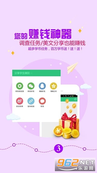 学生赚是安卓手机赚钱软件,它于2013年12月登录各大安卓市场,一经上市,就获得广大用户的好评,是目前手机赚钱市场操作最简单、赚钱速度最快的赚钱软件。就能轻松赚取话费、QB、RMB。特别适合学生党使用;