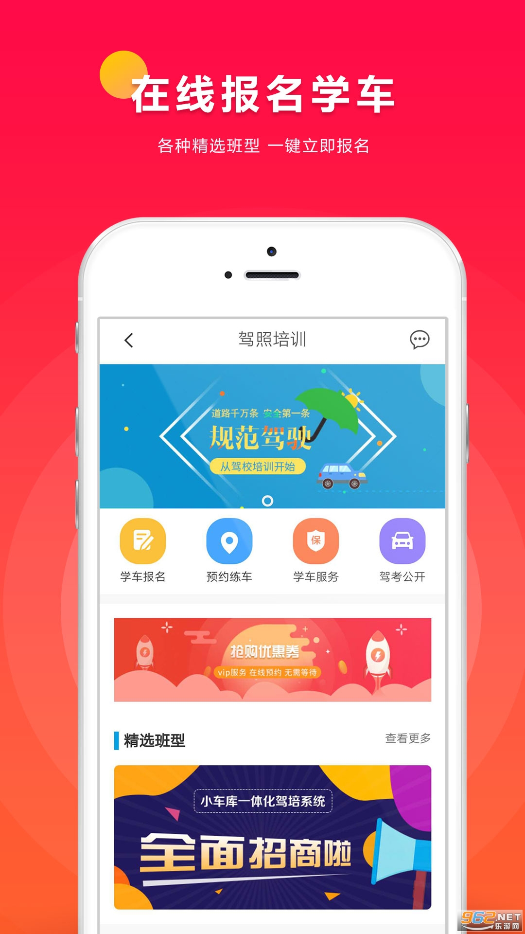 一款为驾校培训学员提供服务的软件,可以进行驾照培训的选择,在线报名,在线约车,在线查看学习进度,在线获得考试信息等。