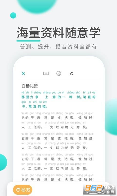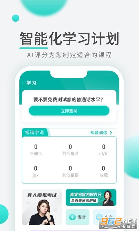 软件采用先进人工智能测评技术,对你的普通话发音进行评分,帮你找出错误发音。针对性纠正,有效提高普通话水平。