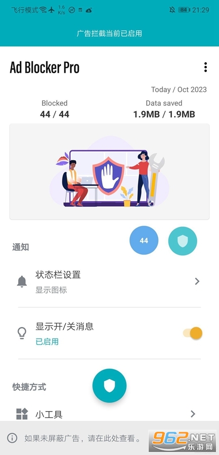 您可以从快速面板、小部件、通知栏中一键打开/关闭广告块。
