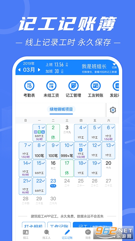 手机一键记工,记录数据永久保存;