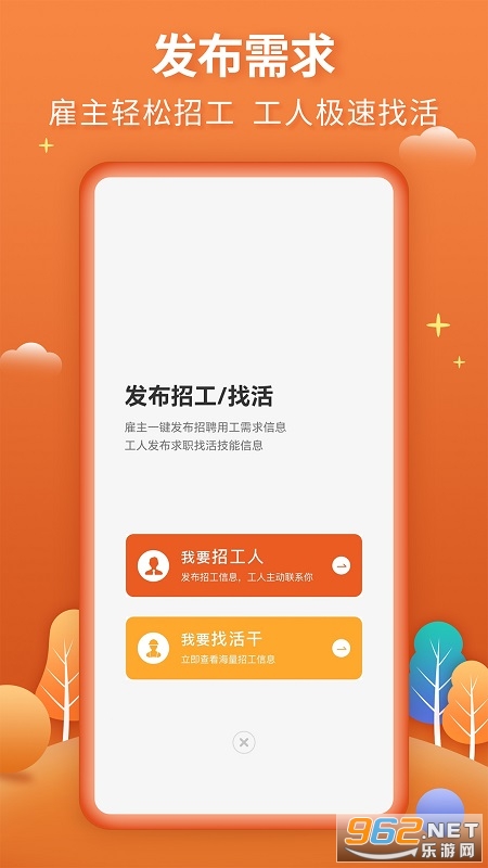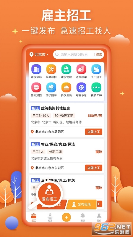 2.一键发布招工、找活,方便快捷,招聘者的贴身之宝,让找工人从此就是这么方便,工人党的福利、招聘者的助手。