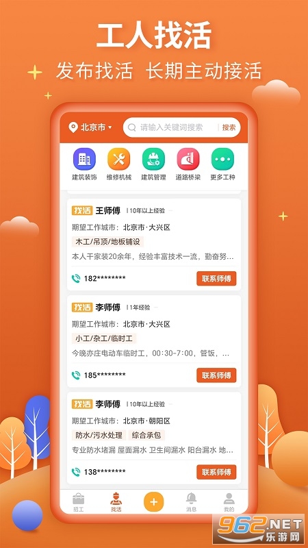 招工找活软件,朋友们也在平台中去找各种工作,比如钢筋工、电工、机修工、木工等等,有着众多的订单可以接取,也可以在平台发布招工信息,去招聘需要的工人,有需要的朋友可以下载试试。