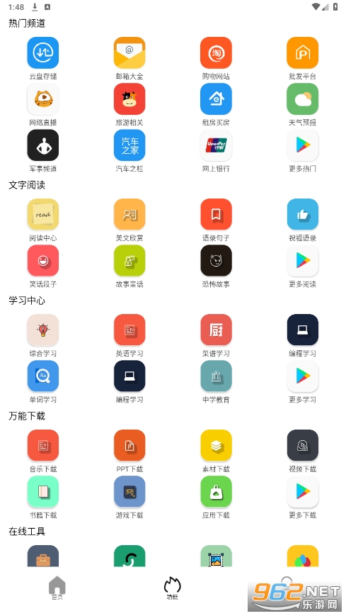 底部功能页面为大家提供了热门频道、文字阅读、学习中心、万能下载、在线工具、夜幕降临等功能,而且每个功能里面都聚合了几十种不同的小工具,绝对能满足大家的各种需求。