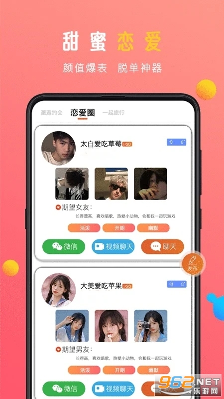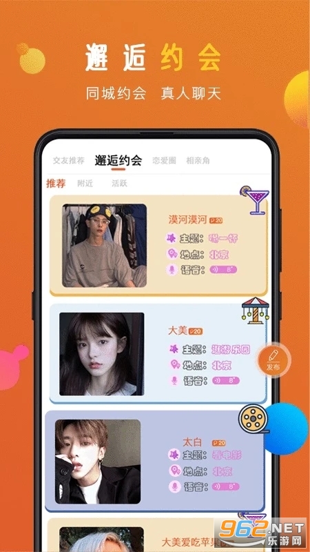 同城约会,真人聊天,遇见附近有趣的灵魂 伴侣,告别单身。线上交友聊呗,线下见 面约会,各种约会主题任你定,带你进入 约会空间。