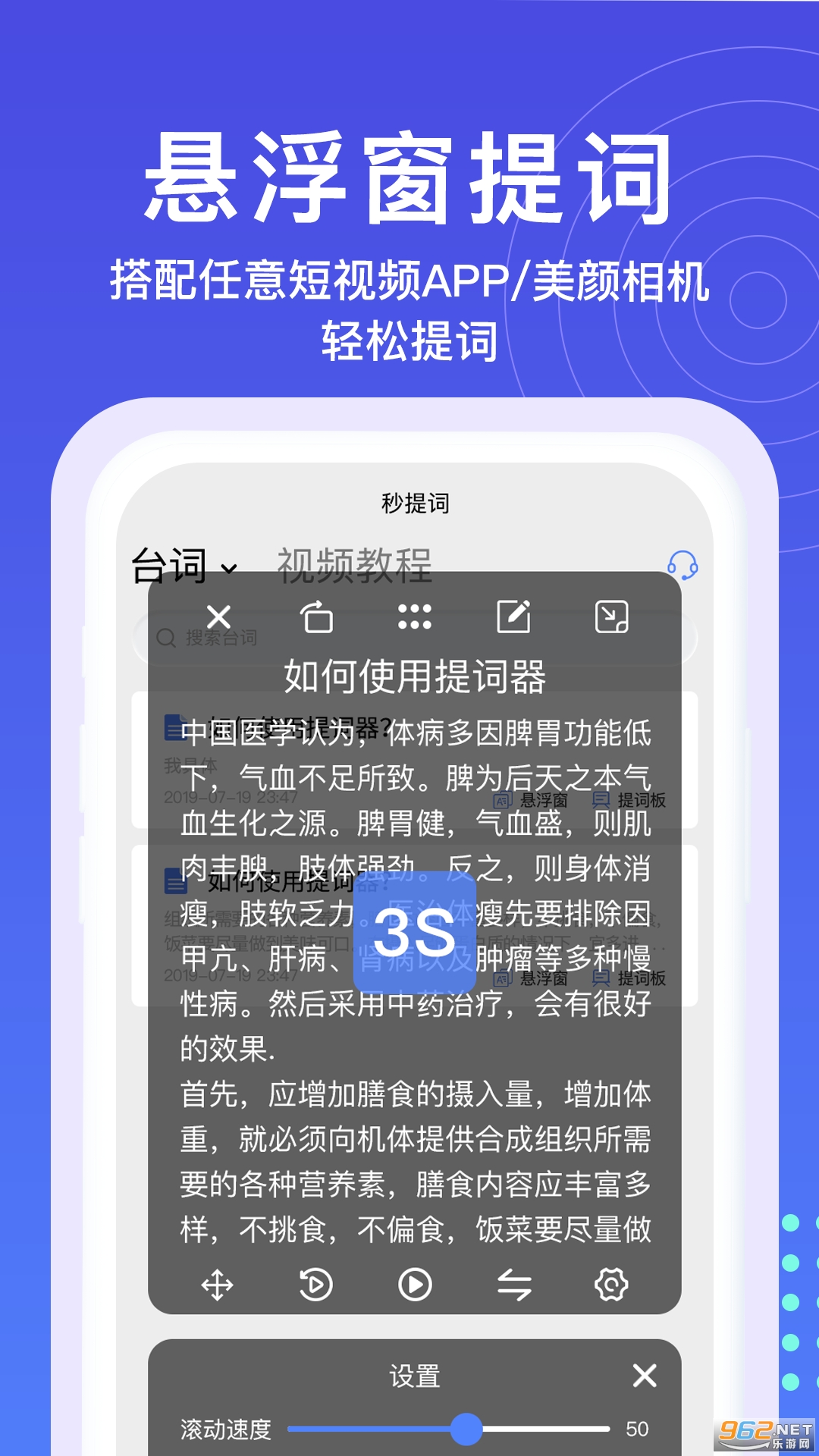 悬浮提词器: "秒提词"提供了独特的AI悬浮提词功能,可以与美颜相机、直播软件等配合使用。悬浮窗提词可以随意调节文字速度、透明度、字体大小和悬浮窗大小,确保录制视频更加顺畅和自然。