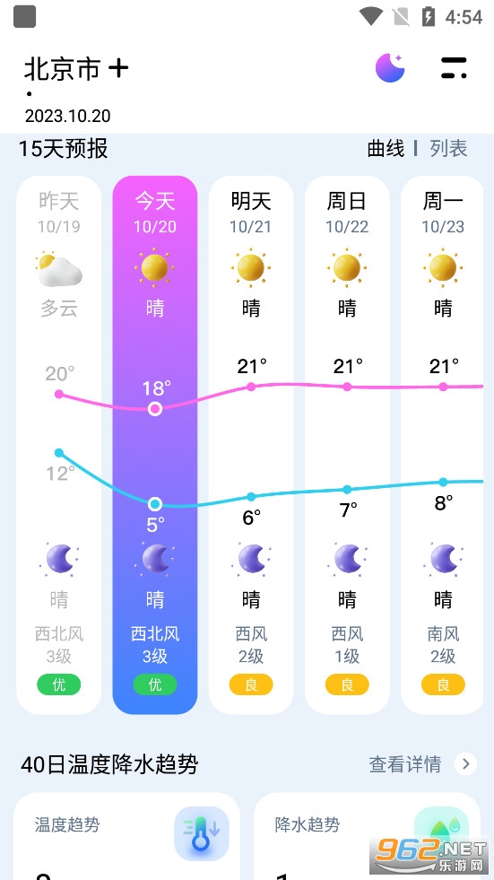 实用的手机天气软件,小巧、简约、漂亮,最重要的是没有广告,非常良心的一个天气软件,可以查看24小时、15天、40天天气情况,有需要的朋友可以下载试试。