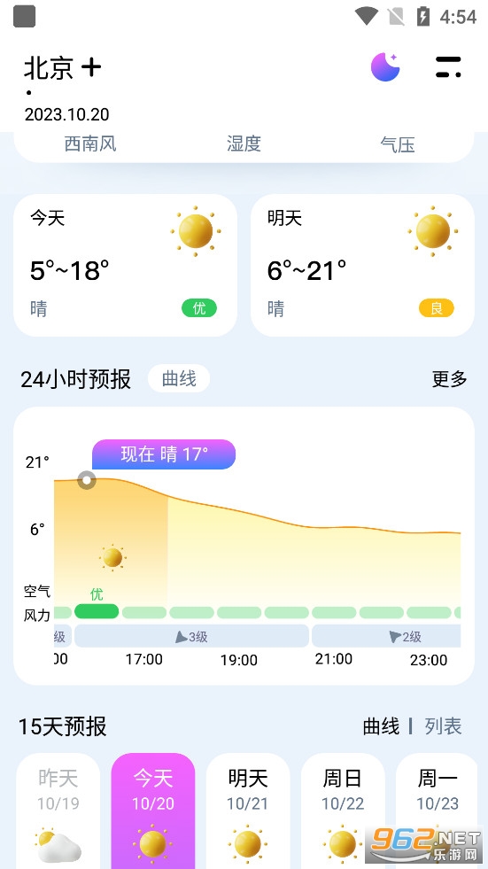 《天气app官方版》是一款为朋友们打造的手机天气预报软件,界面简约,小巧仅10M左右,而且最重要的是没有烦人的广告,朋友们可以在软件中选择自己想要查看的城市,可以查看24小时详细天气情况,也可以查看15天天气情况,为你的出行提供便利。