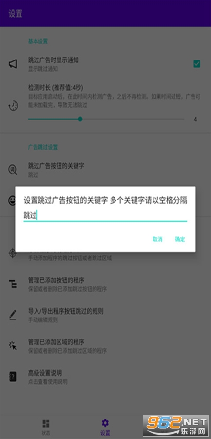 非常不错的跳广告的软件,可以自动的跳过大多数软件的开屏广告,可以自由的设置关键字,跳过各种开屏广告,自动叉掉广告,让你更加方便的使用各种应用,有需要的朋友可以下载试试。