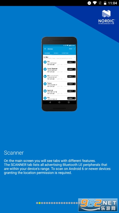 《nRF Connect 安卓版》Connect是一款可以用来扫描、发现和调试你的低功耗低蓝牙设备的应用程序。它支持北欧半导体的设备固件更新配置文件(DFU),使得用户可以更新兼容的外接设备。通过使用nRF Connect,用户可以对附近的蓝牙LE外设进行扫描,并可根据名称、制造商、服务(广告和连接)和RSSI级别筛选这些外设。