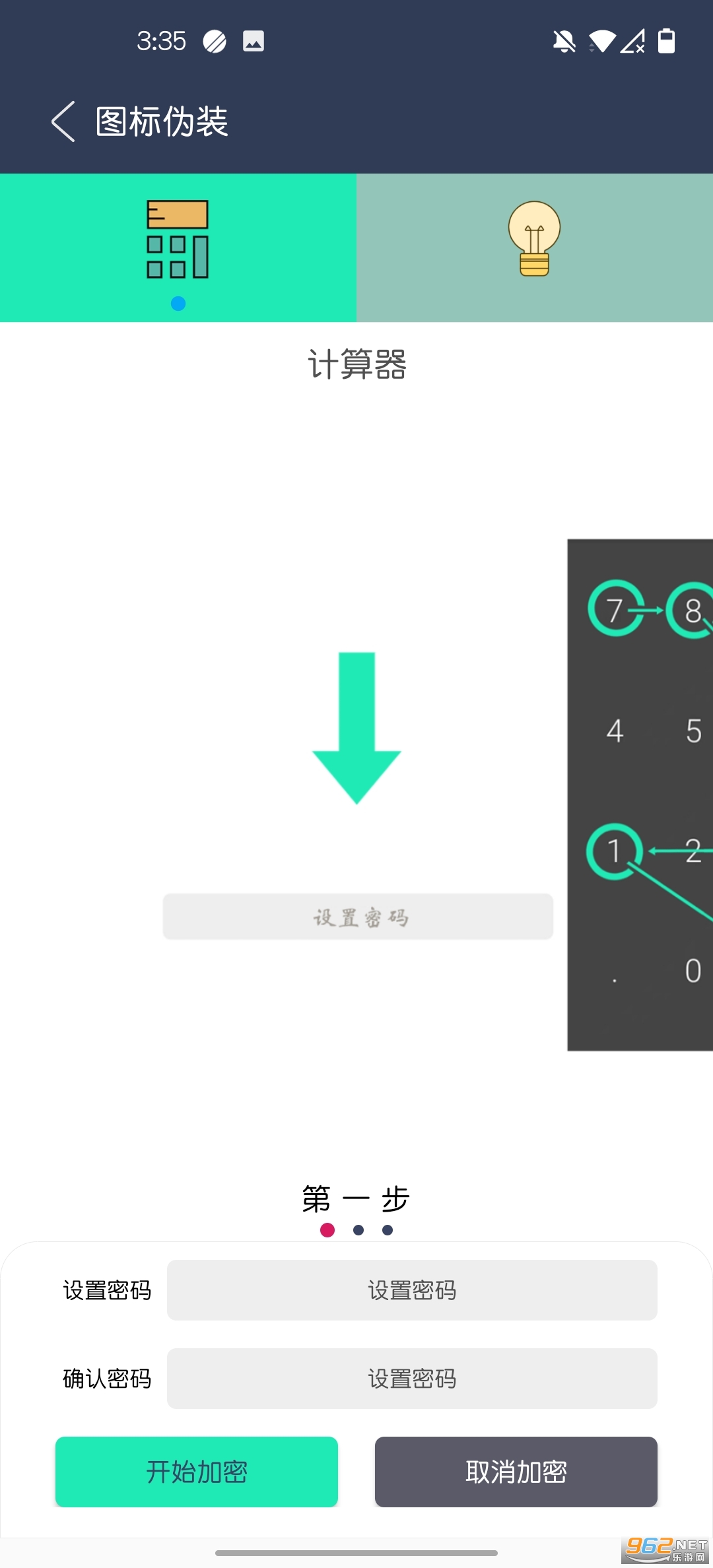 5、点击隐私设置,点击图标伪装,目前有计算机和手电筒两种伪装形式,点击设置密码,计算机图标的,输入好相关数字密码后按“=”,
