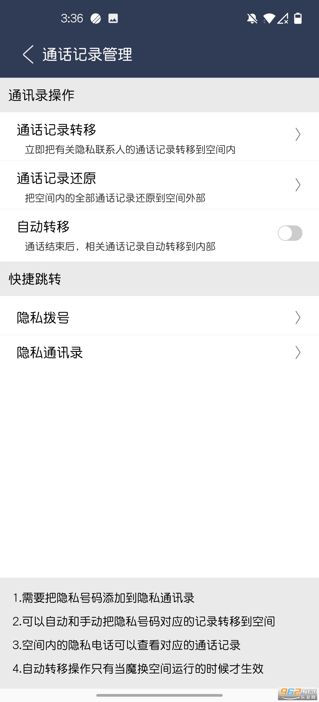 2.可以自动和手动把隐私号码对应的记录转移到空间