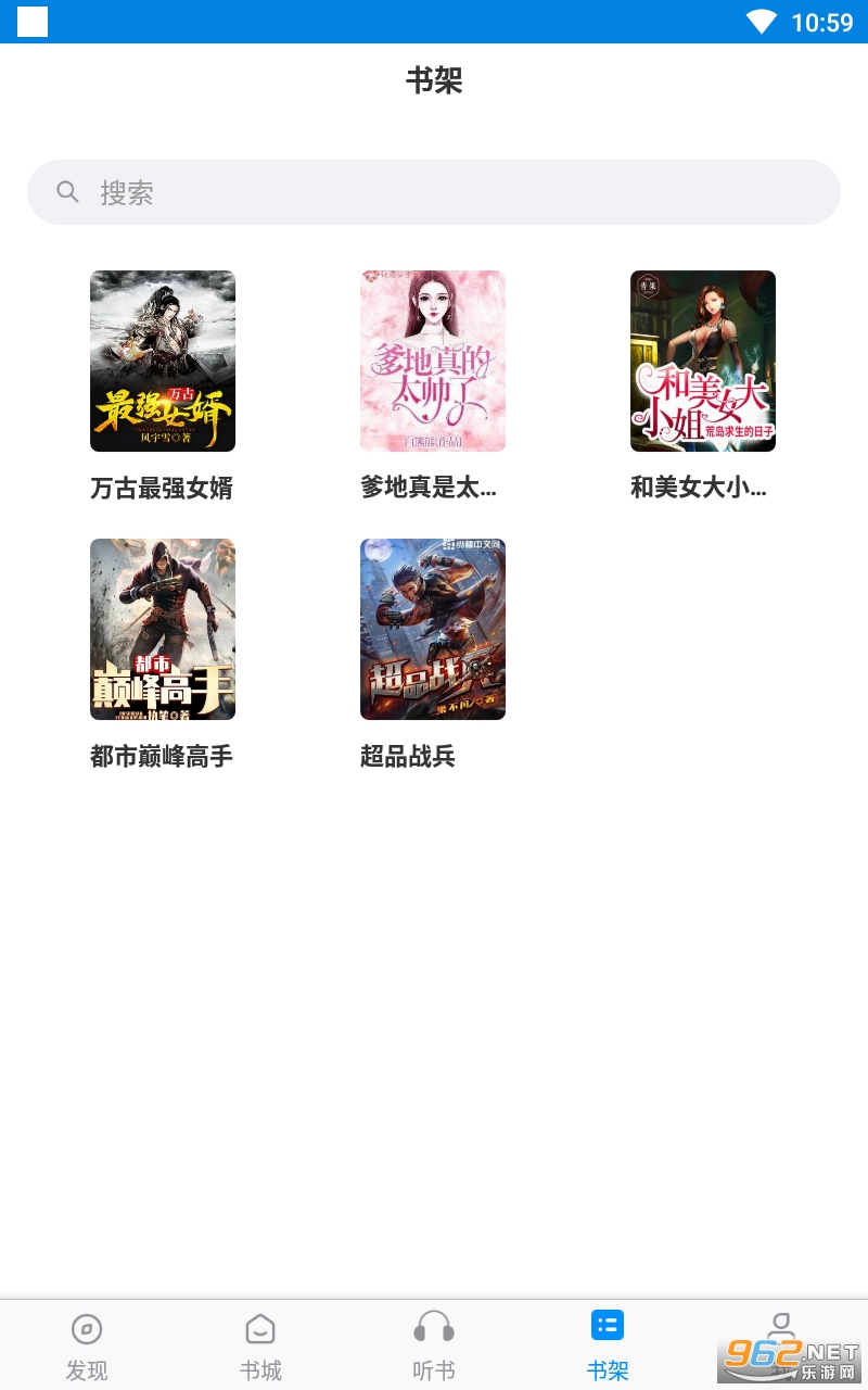 1、软件首页清爽简洁,在书架上有收藏相关作品就会显示,要不就是空空如也,右上角有搜索键,可直接搜索想要阅读的作品。