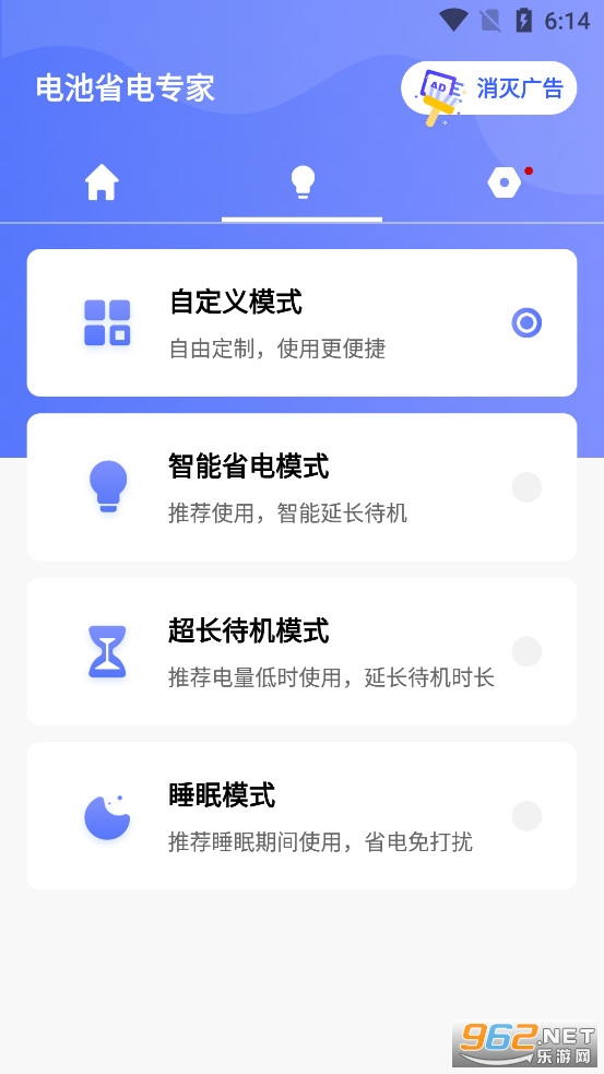 一键省电:自定义模式、智能省电模式、超长待机模式、睡眠模式,多种省电模式任你挑选,只需一键即可全面省电,为你智能延长电池续航时间。