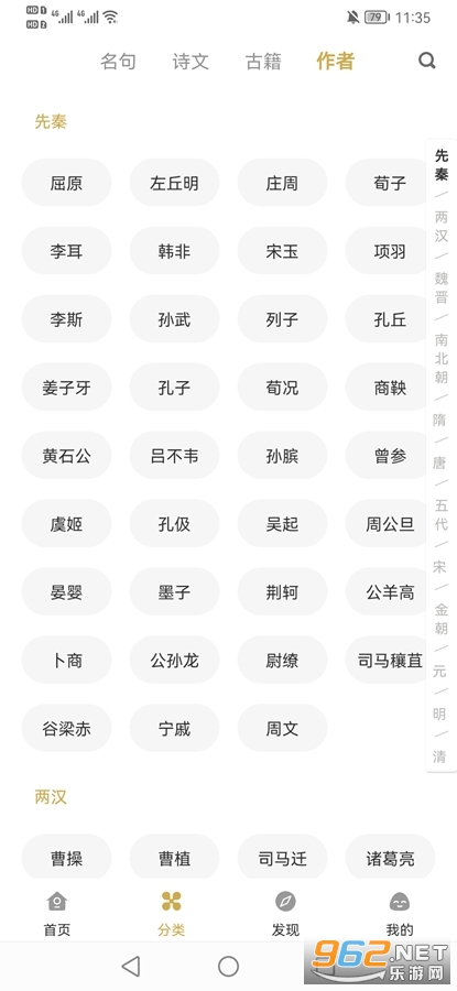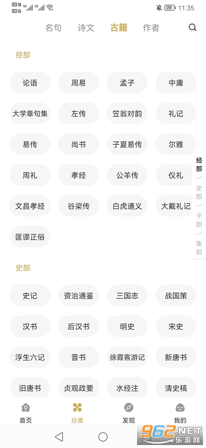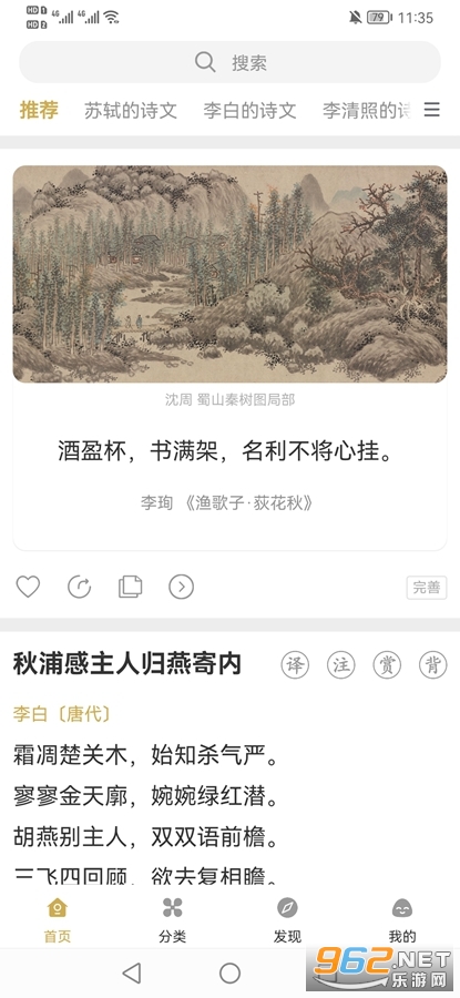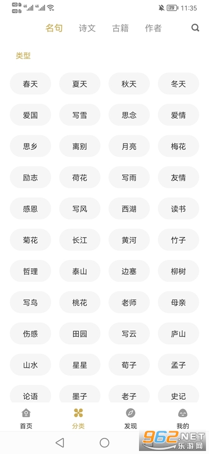 《古文岛app》是一款为朋友们打造的古诗文学习软件,古文岛app中有着详细的分类,比如根据春天、写雪等各种类别来快速查找,还有着古籍、作者等分类,每个诗词都有着译文、注释、赏析,可以让你更好的来学古诗文。